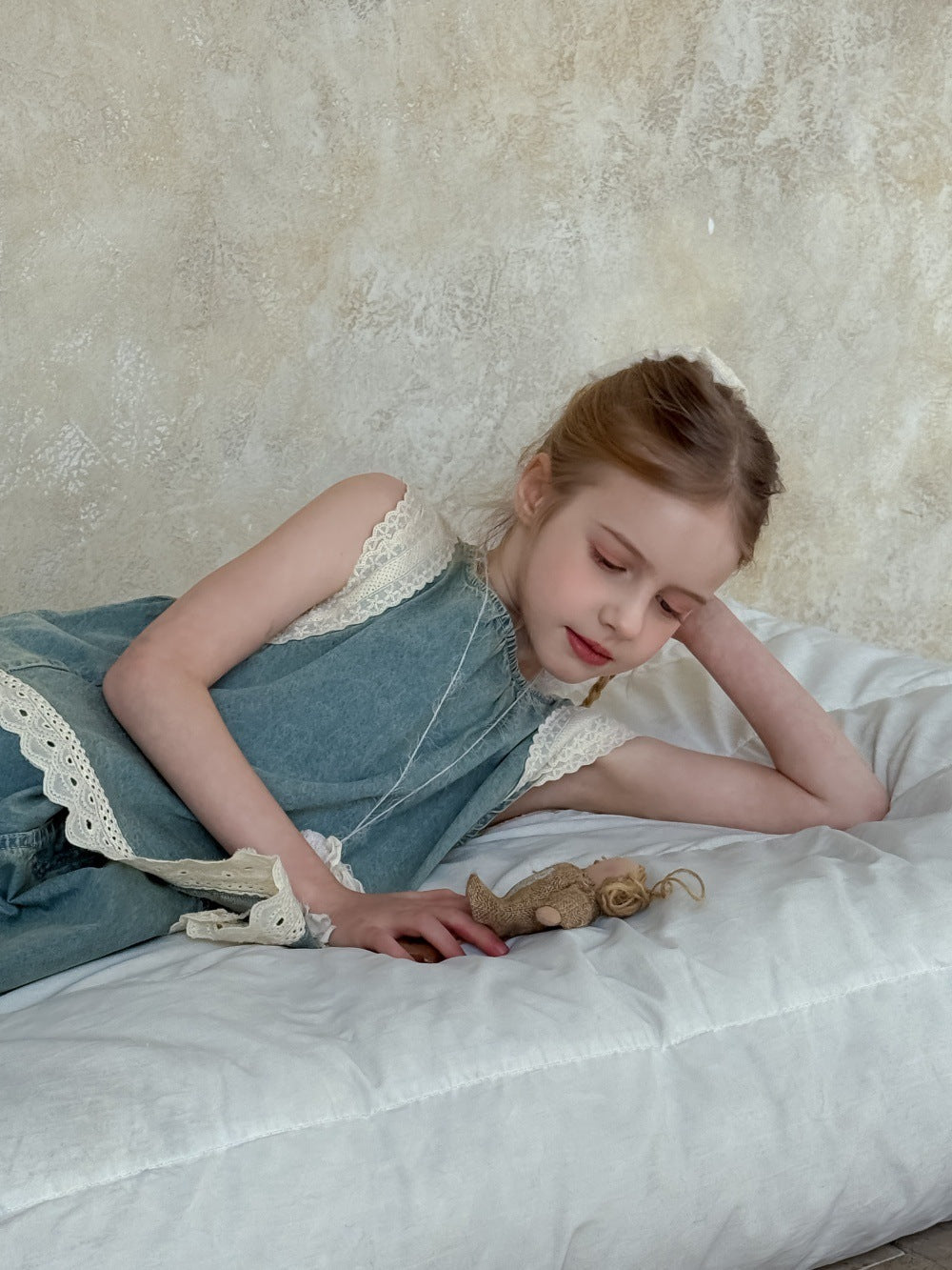 Girls' Lace Trim Denim Cropped Wide-leg Pants Sleeveless Vest Two-piece Set